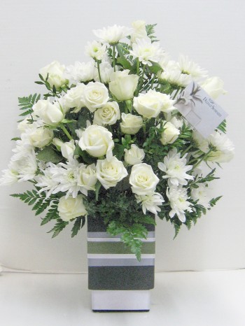 Convey your deepest sympathies with our elegant ribbon-wrapped large vase floral bouquet filled with a tasteful and memorable arrangement of white roses, mini mums and greens (Leather Leaf Fern). To inquire about this item, use the Feedback link. For delivery outside the local area, call Gifted Creations.